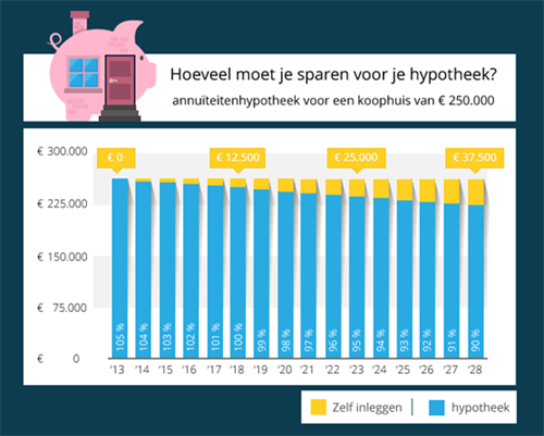 DNB wil dat we nog maar 90% van de waarde van ons huis gaan lenen. Kost je woning € 300.000, dan is je maximale hypotheek in de toekomst dus € 270.000. De andere € 30.000 en de kosten bij het kopen van een eigen huis betaal je dan uit eigen zak.