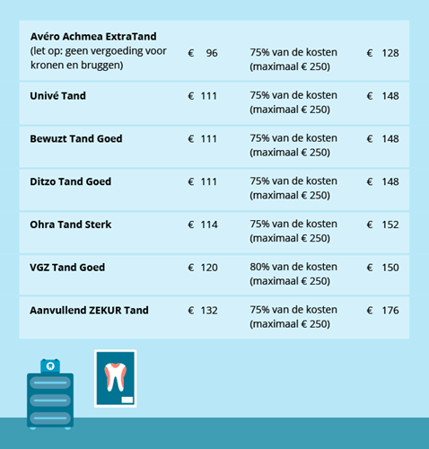 Er zijn veel verschillende aanvullende tandartsverzekeringen. De eenvoudigste verzekeringen kosten rond de € 110 per jaar. Je krijgt dan 75% tot 80% van je tandartskosten vergoed, met een maximumvergoeding van € 250 per jaar.