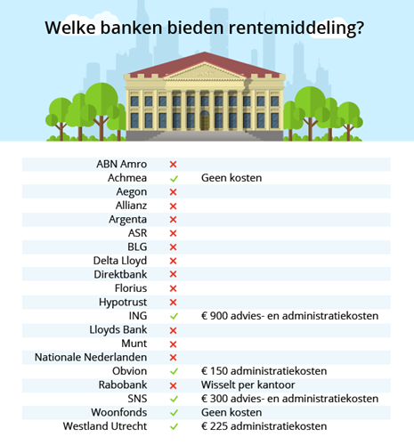 Slechts een beperkt aantal banken biedt rentemiddeling aan: Achmea, ING, Obvion, SNS, Woonfonds en Westland Utrecht. Bij de Rabobank wisselt het beleid per lokaal kantoor: de ene vestiging doet het wel, de andere niet.