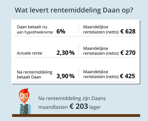 • Daan betaalt op dit moment 6% hypotheekrente. Zijn rentevaste periode loopt nog 4 jaar.