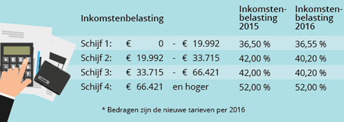Hoe meer je verdient, hoe hoger de belasting is die je betaalt. Die belasting wordt verdeeld over schijven. In schijf 2 en 3 wordt de belasting verlaagd. De belasting over je inkomen tussen € 19.992 en € 66.421 daalt met 1,8 procent.