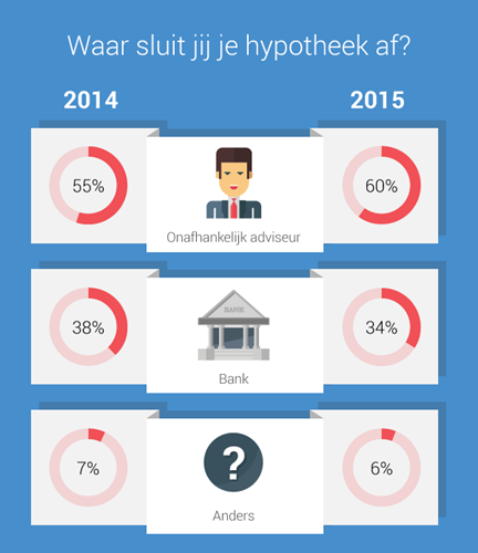 Eind 2015 onderzocht de Autoriteit Financiële Markten (AFM) via welk kanaal een hypotheek afgesloten werd. De onafhankelijk adviseur werd daarbij als meeste genoemd. 60% kiest voor onafhankelijk advies. Omgekeerd kiezen juist minder consumenten voor advies van de bank. Slechts 2% van de Nederlanders kiest voor het zelfstandig afsluiten van een hypotheek.