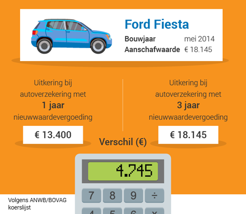 De meeste autoverzekeringen hebben zo'n regeling. 4 op de 5 verzekeraars betalen je de nieuwwaarde uit als je auto al in het eerste jaar gestolen wordt of total loss raakt. Er zijn echter ook autoverzekeraars met een extra uitgebreide nieuwwaarderegeling. Je krijgt bij hen tot 3 jaar lang de nieuwwaarde vergoed. In geld uitgedrukt is dat verschil enorm.
