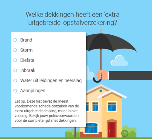 Een extra uitgebreide opstal- of inboedelverzekering bevat een complete lijst met risico's en voorvallen die verzekerd zijn. Als de oorzaak van jouw schade er niet tussen staat, dan is het niet verzekerd.