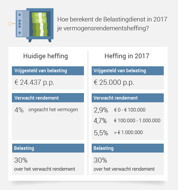 Dat verandert. De minister gaat per 2017 de belastingtarieven voor kleinere vermogens verlagen. De vrijstelling wordt € 25.000 per persoon en het vaste rekentarief daalt naar 2,9% voor spaargeld tot €100.000. Spaarders met een hoger vermogen gaan juist meer betalen. Tussen € 100.000 en € 1.000.000 wordt het tarief 4,7% en boven het miljoen wordt het rekenrendement 5,5%.