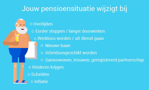 Niet alleen de prestaties van het pensioenfonds hebben invloed op jouw pensioen. Een andere baan, het krijgen van kinderen of eerder willen stoppen met werken. Allemaal zaken die je pensioensituatie  beïnvloeden. Voor sommige kun je zelf kiezen, in tegenstelling tot bijvoorbeeld arbeidsongeschiktheid. Het is aan te raden op Mijnpensioenoverzicht.nl te lezen wat wijzigingen in je situatie betekenen voor zowel jou als eventuele partner en kinderen.