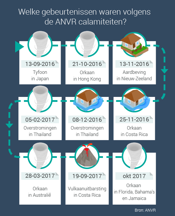 Maak je gebruik van een ANVR-touroperator? Deze reisorganisaties zijn aangesloten bij Stichting Calamiteitenfonds Reizen (SCR). Bij het boeken van je vakantie betaal je automatisch € 2,50 voor het calamiteitenfonds. Kan de reisorganisatie de reis niet meer uitvoeren vanwege een (dreigende) calamiteit, dan krijg je een vergoeding.