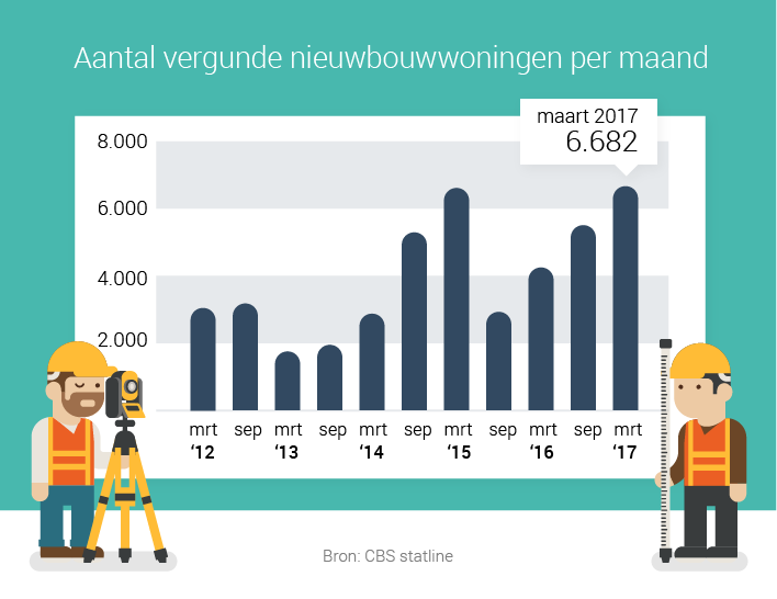 In maart werden in totaal 6.682 nieuwe bouwvergunningen voor huizen afgegeven. Zoveel zijn er in twee jaar niet meer in een maand verstrekt. We hebben ook enorm veel nieuwbouw nodig. Het aantal huizen dat te koop staat, is veel te laag om aan de vraag te voldoen. Wordt er nu genoeg gebouwd? Waarschijnlijk niet. Er moet nog een achterstand ingelopen worden.