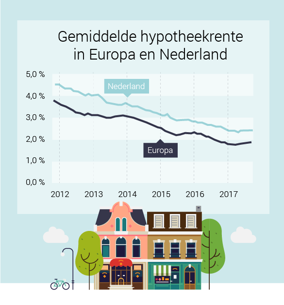 Die verschillen worden vooral veroorzaakt door andere regelgeving. We vinden het in Nederland allemaal erg jammer dat je in 2017 'nog maar' 101 procent van de koopsom mag lenen. In het buitenland zullen ze met hun oren klapperen dat je überhaupt meer mag lenen dan je huis waard is. Als je maximaal 80 procent van de koopsom mag lenen, dan is het risico voor de bank op wanbetaling kleiner en dus de rente lager.