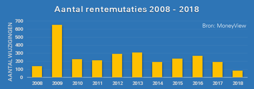 In het laatste kwartaal van 2018 zijn 10 rentewijzigingen bij banken geregistreerd. Dit waren er circa vier keer minder dan in hetzelfde kwartaal een jaar eerder. Het goede nieuws is dat de stroom renteverlagingen langzaam tot stilstand komt. Helaas komt dit deels omdat het weinig lager meer kan. Geen van de grote banken durft het vooralsnog aan om de rente verder te verlagen naar het nulpunt. Een verlaging van de grotere banken is voor de concurrentie vaak reden om te volgen.