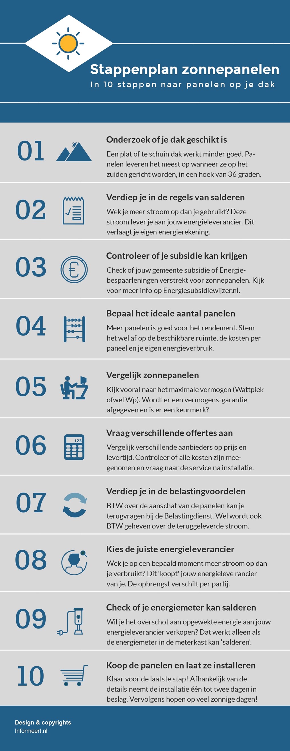 Het opwekken van stroom met zon, water of wind is niet het specialisme van Demo Advies. Vraag ons dan ook niet welk soort paneel jij het best op je dak kan leggen of wat de exacte opbrengst is van een bepaald type. Wel helpen we je graag op weg met de onderstaande infographic. Met het stappenplan bepaal je of de installatie van zonnepanelen iets voor jou is en hoe het aan te pakken.