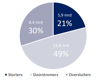 Het aantal oversluiters lag in 2017 op 78.000 en is in het opvolgende jaar gestegen naar 96.000. Vooral in het laatste kwartaal zat de vaart er goed in. Als we kijken naar de hypotheekomzet bedraagt de stijging in die periode zelfs 36 procent in verhouding tot 2017. Hiermee overstijgt dit het bedrag dat starters aan hypotheek hebben afgesloten.