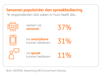 Circa zes op de tien Nederlanders heeft al slimme apparaten in huis die ze via spraak, sensoren of smartphone kunnen bedienen. Dat lijkt veel maar wil niet zeggen dat het hele huis is voorzien van automatische snufjes. Mensen hebben relatief vaak de volgende apparatuur in huis: