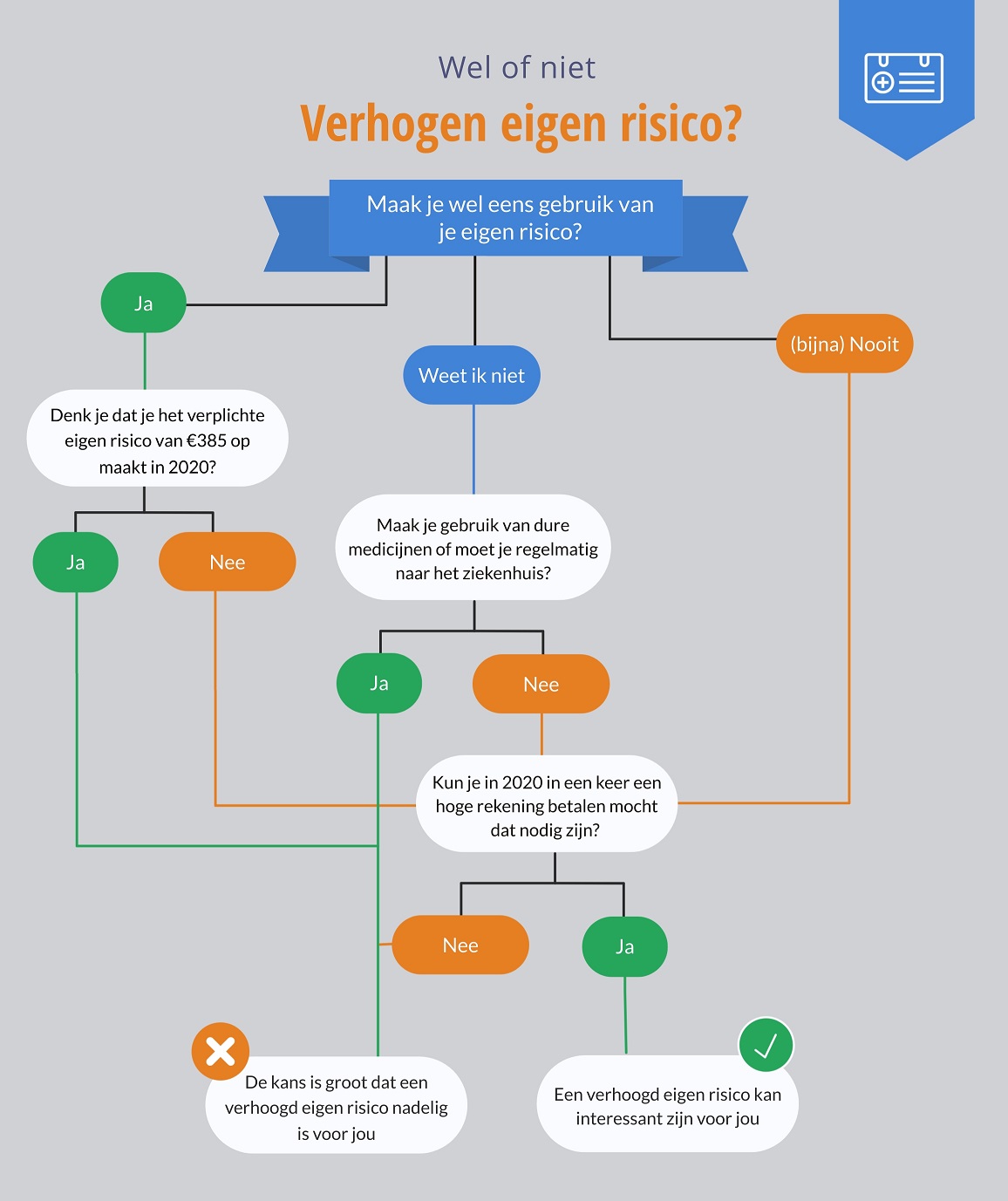 Pas achteraf weet je zeker of je baat hebt gehad van een hoger eigen risico. Bedenk vooraf wel wat je verwacht aan zorgkosten. Ga verder voor jezelf na of je een flinke zorgrekening zonder problemen kan betalen. Is dit het geval en heb je al jaren geen arts van dichtbij gezien? Een verhoogd eigen risico ligt in dat geval meer voor de hand dan wanneer je kind aan huis bent in de dokterspost en iedere maand de eindjes aan elkaar knoopt.