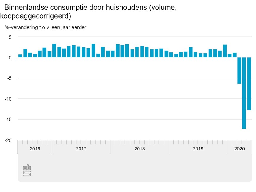Afgelopen mei hebben we met zijn allen 12,8 procent minder besteed dan in mei vorig jaar, meldt het CBS. Deze krimp is kleiner dan in april. Wel gaat het alsnog om de op één na grootste ooit gemeten. Vooral aan diensten is minder uitgegeven. Onder andere voor eten en drinken werd wel de portemonnee getrokken.