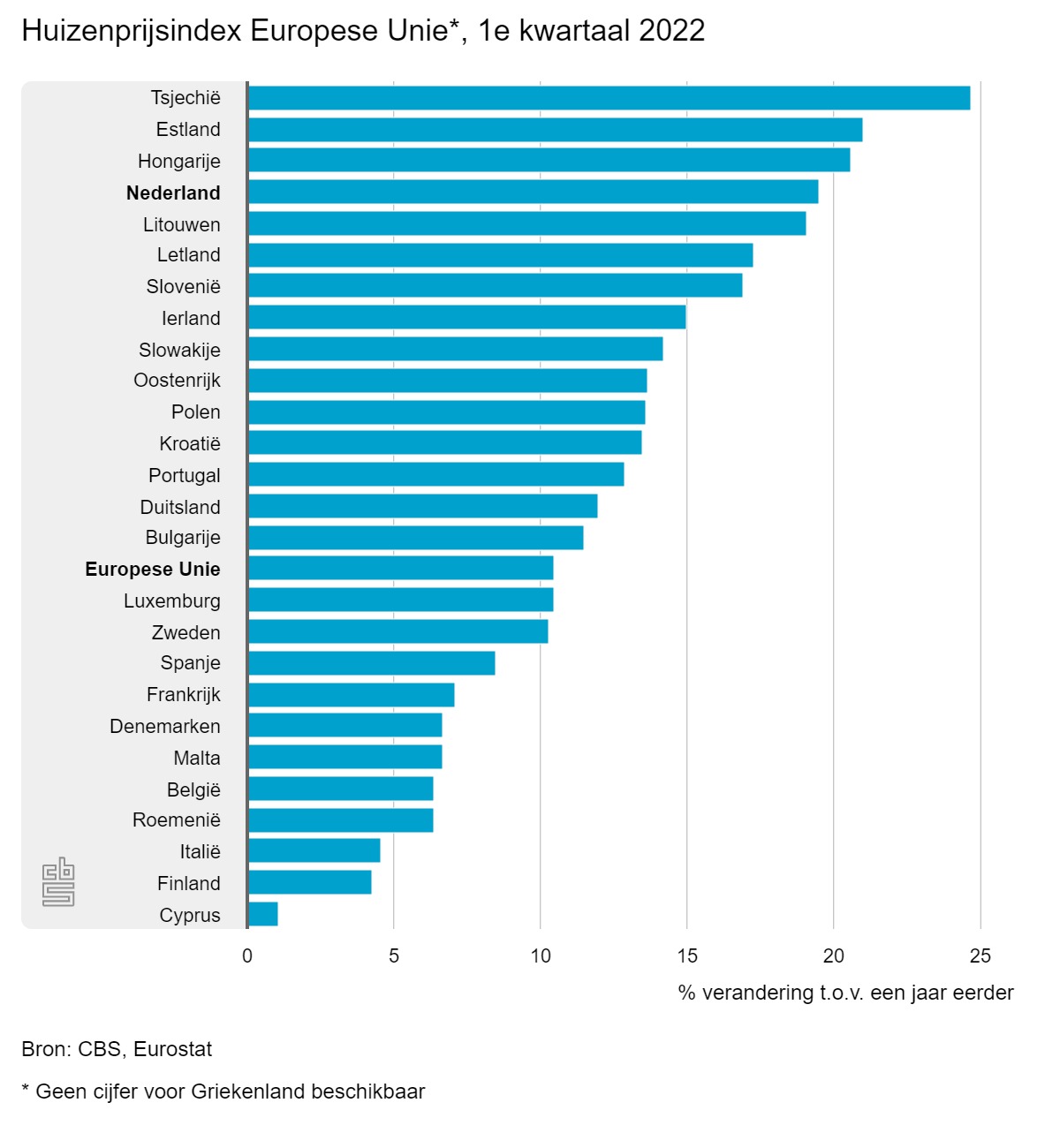 De gemiddelde stijging van de huizenprijs is in Nederland bijna het dubbele van het Europees gemiddelde (10,5%). Toch kan het nog gekker. In Tsjechië steeg de huizenprijs in het eerste kwartaal van 2022 met maar liefst 24,7 procent vergeleken met hetzelfde kwartaal in 2021. Op nummer twee en drie staan Estland (+21%) en Hongarije (+20,6%). Dit blijkt uit cijfers van het Centraal Bureau voor de Statistiek (CBS).