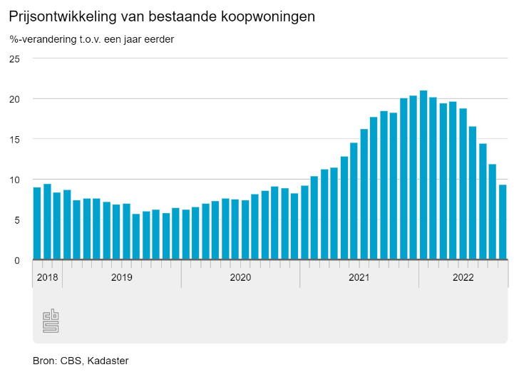 In september waren bestaande woningen 9,4 procent duurder dan in dezelfde maand vorig jaar. Op maandbasis dalen de woningprijzen echter al vijf maanden. Zo was in augustus de jaarlijkse stijging nog 11,9 procent. Op zich is een daling van de prijzen geen reden voor paniek. Sinds 2021 is er namelijk sprake van een explosieve stijging. De jaarlijkse stijging lijkt nu te normaliseren, zoals duidelijk wordt uit onderstaande CBS-gegevens.